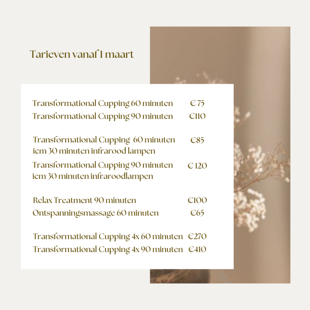 Vanaf 1 maart zullen er nieuwe tarieven gelden. De maanden januari en februari kun je dus nog gebruik maken van de oude tarieven. Tevens kun je in de maanden januari en februari gratis kennismaken met de infraroodlampen i.c.m. een Transformational cupping sessie. Wil je graag nog een Transformational cupping sessie inplannen voor januari of februari klik dan op de link.